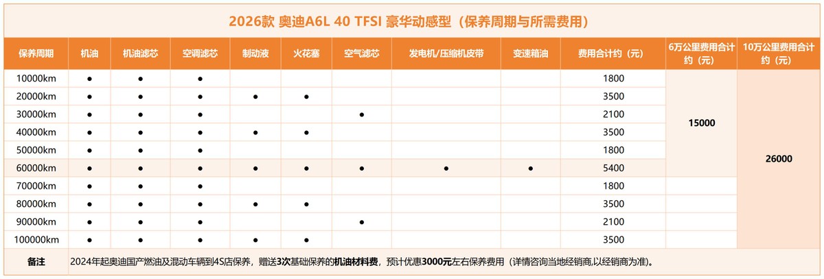 如果不考虑整车质保因素,不在4S店做保养的话,保养费用会大幅降低。仍以2026款奥迪A6L 40 TFSI 豪华致雅型为例,行驶6万公里4S店外保养费用预计7200元左右,10万公里保养费用预计12000元左右。