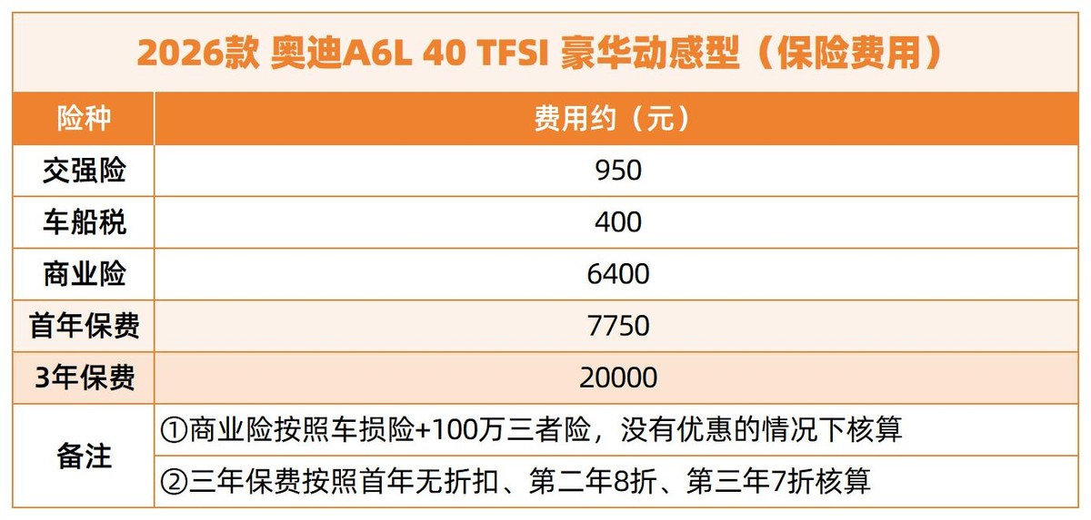 以2026款 奥迪A6L 40 TFSI 豪华动感型为例,商业险仅投保车损险与100万三者险的情况下,在没有优惠返利的基础上,首年保险费用约为7750元,三年保费合计约20000元。