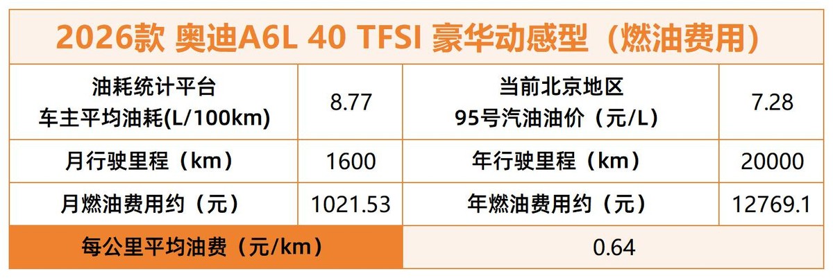 仍然以2026款 奥迪A6L 40 TFSI 豪华动感型为例,根据网络燃油统计平台数据,车主每百公里平均油耗8.77L,按照北京地区当前95号汽油油价7.28元/L,每年行驶2万公里核算,每年燃油费用约12769.12元。平均每公里油耗花费0.64元