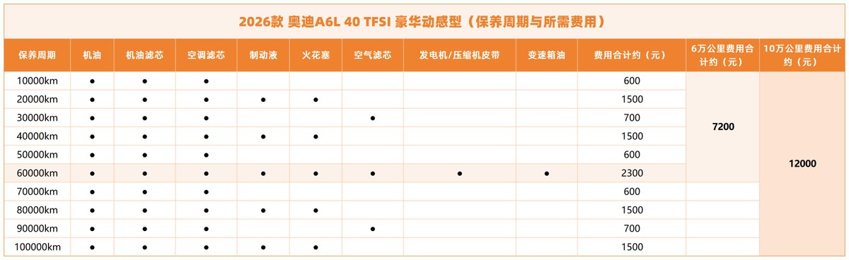 通过一汽奥迪官网查询,以2026款奥迪A6L 40 TFSI 豪华致雅型为例,行驶6万公里在4S店保养费用大约1.5万元左右,行驶10万公在4S店费用2.6万元左右。如果按1年行驶2万公里计算,购车第一年保养费用预计在3300元左右。