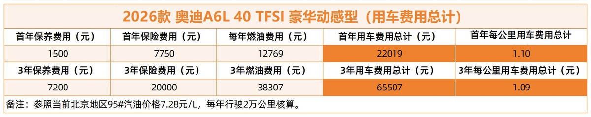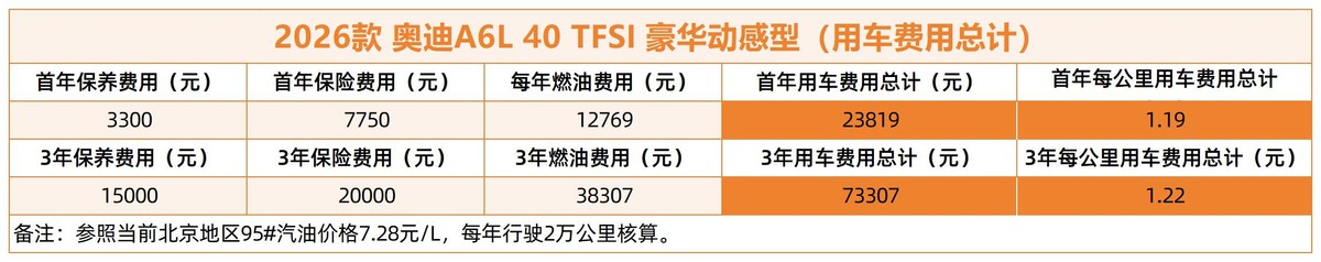 如果以年行驶2万公里,95#汽油7.28元/L统计,还以2026款 奥迪A6L 40 TFSI 豪华动感型为例,首年用车费用总计约23819元,平均每公里综合用车费用约1.19元。三年用车综合费用约77307元,每公里综合用车费用约1.22元。以上用车成本未包含停车、洗车、过路过桥等随机用车费用。