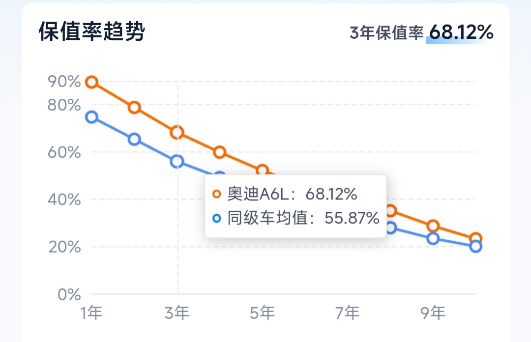通过各家二手车交易平台数据,参照奥迪A6L以往年款车型在售的二手车价格测算,奥迪A6L的保值率一直不错,与同级别车型表比较还是很能打的。