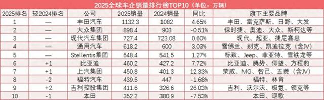 最新全球车企销量榜单(2025)揭晓,比亚迪、吉利两家中国民营车企,强势跻身全球前十,不仅超越日产、本田这些日系老牌巨头,更成为中国汽车终结日本汽车25年全球销冠神话的核心力量。