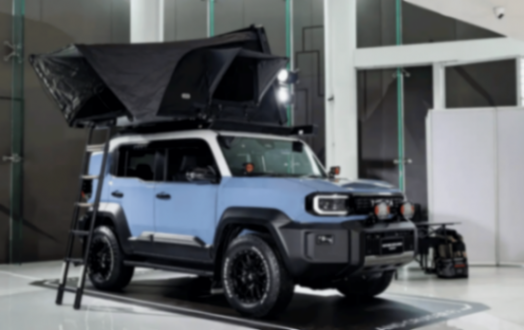 我们看到,新车相对聚焦长途穿越与露营场景,车头加装辅助照明灯,车顶集成全尺寸露营平台,搭配可展开的遮阳棚,随时搭建户外休憩空间。同样配备越野轮胎,保障野外通行能力。