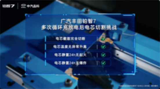 该测试分2轮进行,用于测试的2块单体电芯,均处于100%满电状态,其中一块为全新;另一块则经过了800多次循环充放电、等效行驶里程超30万公里。该测试为“全截面切割”,短路面积远超常规的针刺测试。测试结果显示,被切割的电芯温度无异常升高,静置24小时后无起火、无爆炸,这意味着,铂智7在最严重事故发生后,即使电芯受损,车辆也没有起火危险,确保乘员不受二次伤害;因救援需要而切割车辆时,同样不必担心切割触及电芯而引发火情。