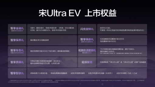 比亚迪王朝正在构建一个从购车、用车、到养车的全链路无忧体系。为此,宋UltraEV带来了“0元购、0元用、0元养”的超重磅购车权益!同时还有其他丰富权益,为用户带来超值购车体验。
