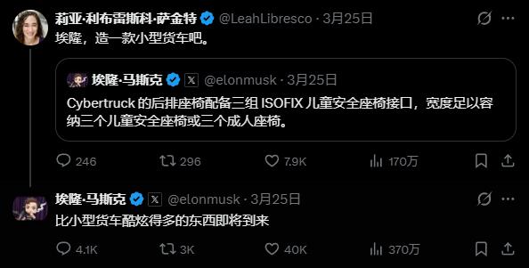 前天,马斯克发帖宣传纯电皮卡 Cybertruck 后排座椅配有三组 ISOFIX 儿童安全座椅接口时,有人建议造一款小型货车。