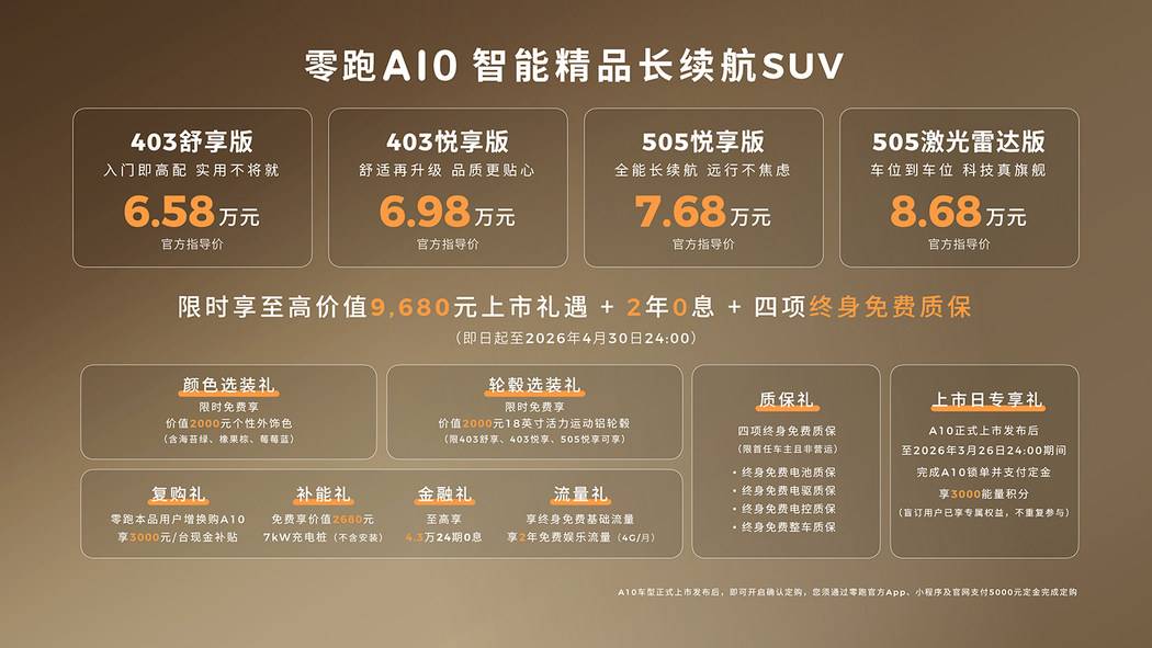 作为零跑面向全球的全新车型,零跑A10 设计、配置与验证全流程均符合全球标准,未来将登陆近40 个国家/地区销售。新车推出403舒享版(6.58 万)、403 悦享版(6.98 万)、505 悦享版(7.68 万)、505 激光雷达版(8.68 万)四个版本,即日起至 4 月 30 日还有限时上市权益,价值高达 9680 元,包括选装礼、复购礼、补能礼等多重好礼。
