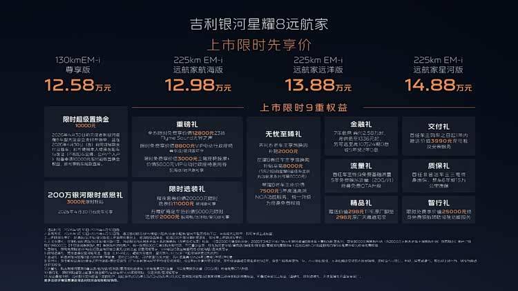 3 月 30 日,吉利银河星耀 8 远航家系列正式完成加新上市,此次新车在原有 130km EM-i 尊享版基础上,新增三款 225km EM-i 续航版本,上市限时先享价区间为 12.58 万 - 14.88 万元。同时,品牌携手艺人黄宗泽以场景化形式演绎新车核心产品力,还推出 9 重购车权益。