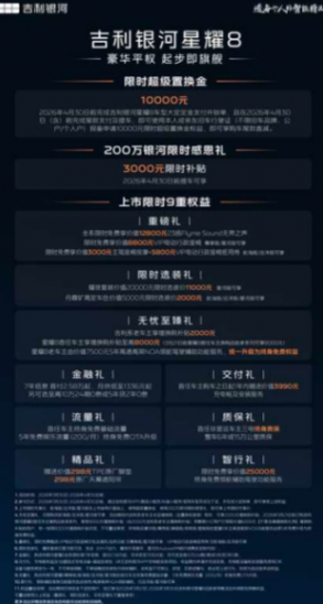 使用与质保层面,新车首任车主可享终身免费基础流量、5 年免费娱乐流量(20G / 月)以及终身免费 OTA 升级;星耀 8 老车主的 5 年高速高架 NOA 功能服务可统一升级为终身免费权益。质保方面,首任非营运车主享电池终身质保、整车 6 年或 15 万公里质保。此外,用户还可享受 200 万银河限时感恩礼,以及价值 298 元的 TPE 原厂脚垫和 298 元的原厂天幕遮阳帘精品礼,还有限时免费享价值 25000 元终身免费领航辅助驾驶功能服务的智行礼。