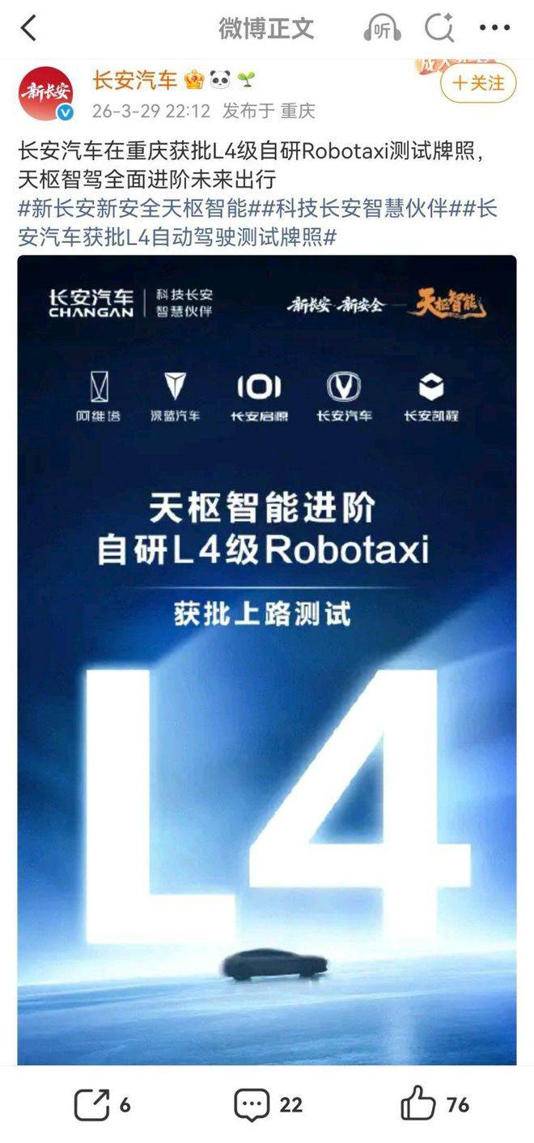 2026年3月29日,就在蓝鲸超擎混动发布的前一天,长安汽车宣布其自研Robotaxi产品正式取得重庆市L4级自动驾驶测试牌照。这是北斗天枢2.0智能化战略的重要落地成果。该战略计划累计投入500亿元构建智能驾驶核心技术体系。