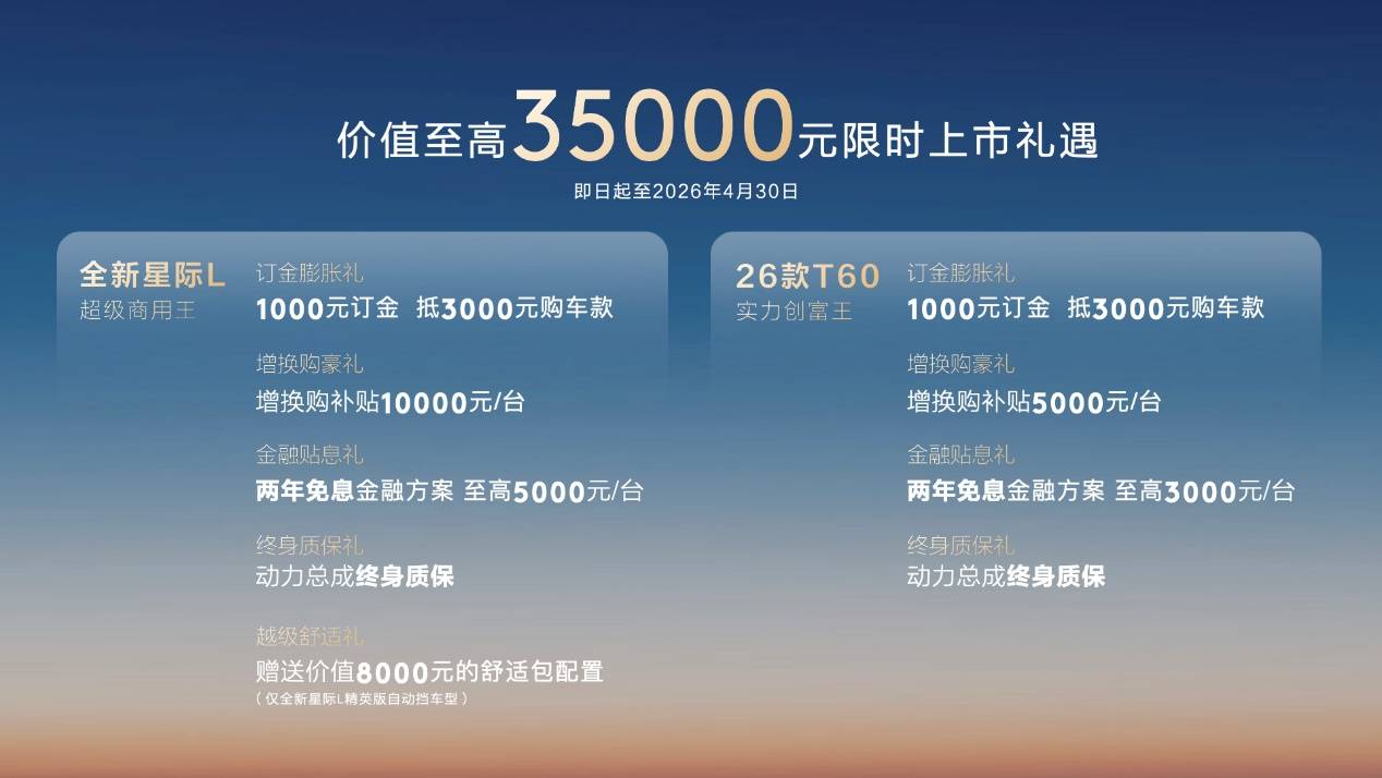具体价格上,全新星际L售价为10.88万-15.98万元,26款星际EV售价为24.98万元,26款T60售价为7.98万-10.18万元;即日起至4月30日,下订用户可享受综合权益至高3.5万元的上市礼遇。大通还同步推出了“7天免费试用”购车模式,允许用户在购车前实地体验车辆性能,并启动“超级性能体验日”活动。