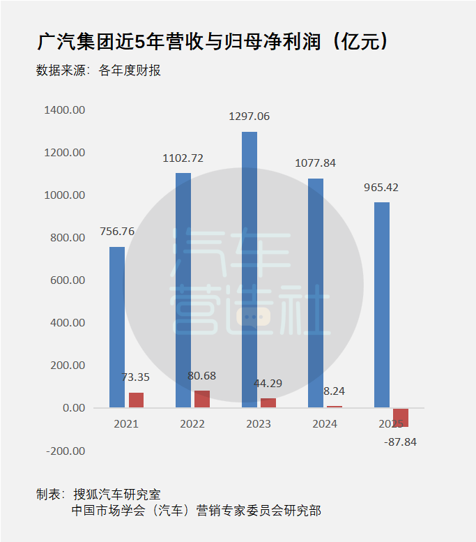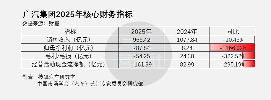 这几乎可以算是广汽近年最沉重的一份年报。2025年,广汽集团合并口径销售收入约965.42亿元,同比下降10.43%;归属于母公司股东的净亏损约87.84亿元,而2024年同期还是盈利8.24亿元;毛利从上年的24.38亿元转为毛损54.25亿元;经营活动现金流净额从82.99亿元转为负161.99亿元。