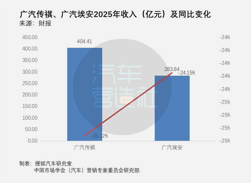 年报显示,2025年广汽自主品牌销量60.92万辆,同比下降22.83%。拆开看,广汽传祺销量31.92万辆,同比下降23.02%,销售收入404.41亿元;广汽埃安销量29.01万辆,同比下降22.62%,销售收入283.84亿元。也就是说,在广汽最需要自主品牌站出来的时候,自主板块自己也在承压。