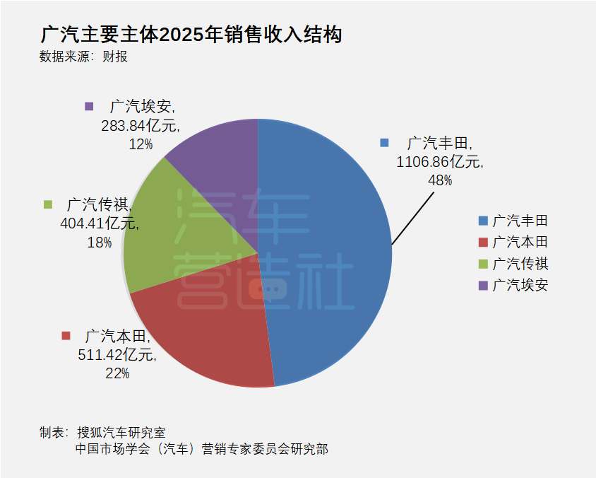 合资板块一直以来都是广汽集团的基本盘和利润的承重柱。按广汽年报披露,2025年广汽丰田销售收入1106.86亿元,同比增长1.04%;广汽本田销售收入511.42亿元,同比下降25.07%。对比之下,全年销售收入404.41亿元,广汽埃安为283.84亿元。