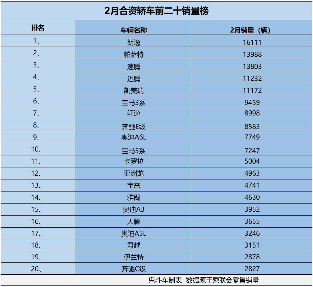 销量表现能再次验证这一观点,日前,乘联会发布2月车市零售销量数据,鬼哥整理出2月合资轿车销量排名前二十榜单,榜单上,共有5款合资轿车销量过万,接下来,看看具体车型排名与销量表现。