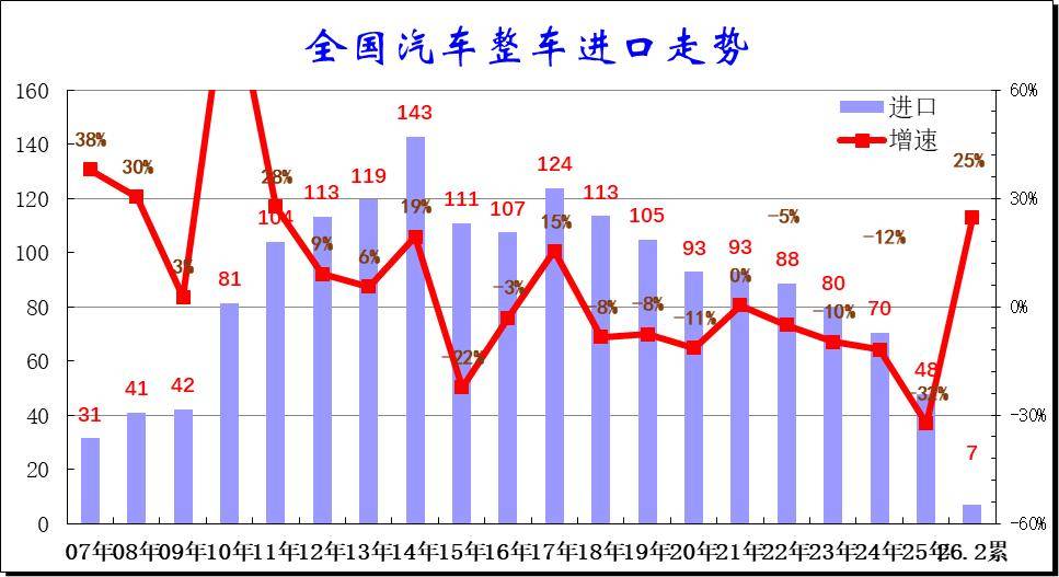 在2014年进口车达到143万辆峰值后下行,2016-2017年进口增速稍有企稳改善,2018年以来至今持续下滑,2024年进口规模持续锐减,全年进口仅有70万辆,同比下降12%。而2025年进口汽车48万辆,同比下降32%,进口车持续萎缩压力较大。2026年1-2月进口汽车7万辆,同比增25%,进口车进口量回升明显。