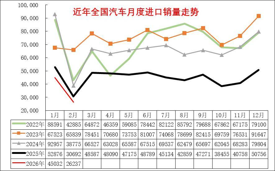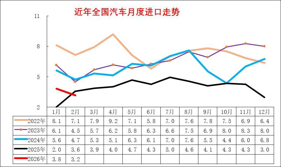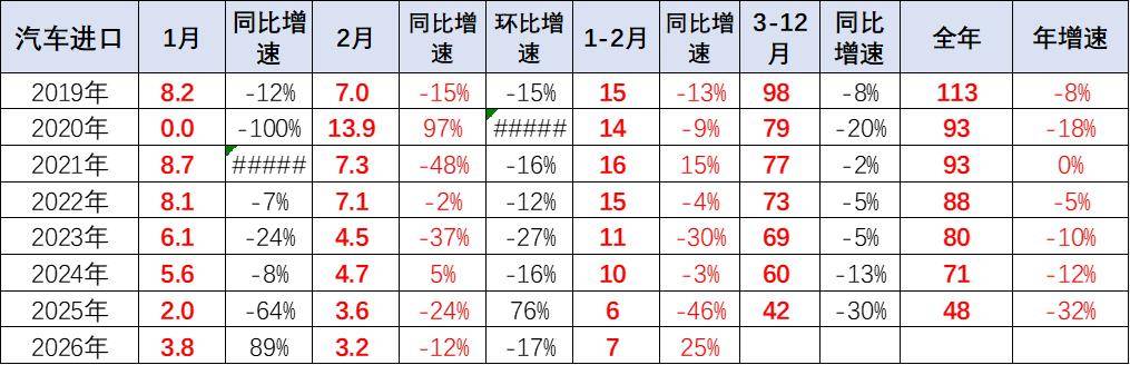由于2025年1月基数低,因此2026年1-2月进口汽车7万辆,同比增25%,这是近期少见的1-2月巨大增长,主要原因是因为2024年年末特朗普上台前的担忧导致2024年末进口车多。其中2026年2月进口车3.2万辆,同比下滑12%,环比1月下降17%,市场增速逐步回归。
