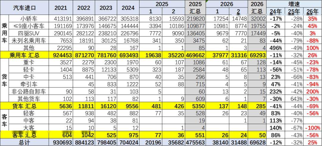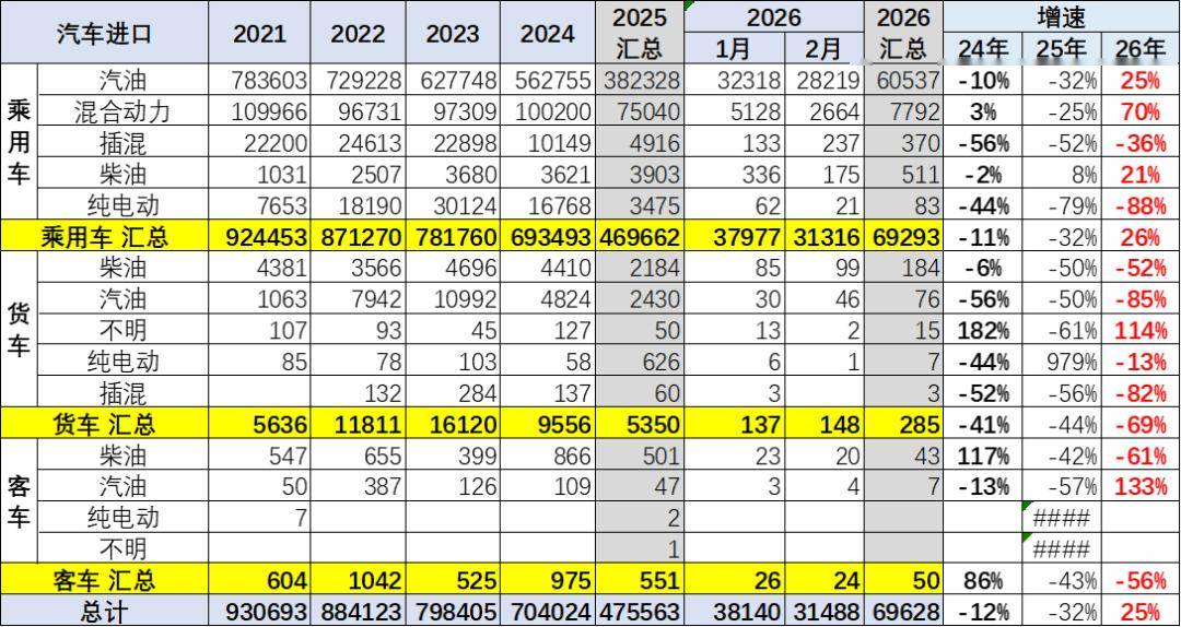 2019年以来各类进口车型全面下滑。传统的卡车目前快速回落明显。2026年1-2月乘用车的进口小于需求,持续去库存。