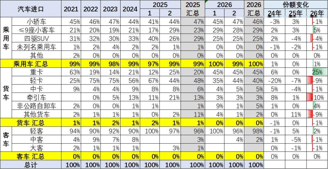 乘用车中2026年1-2月进口轿车占比46%;进口四驱SUV进口占比25%;而的未列名机动车进口占比几乎为零。2026年的商用车进口表现一般,尤其是轻卡进口下滑较大,近期的进口皮卡也很弱。