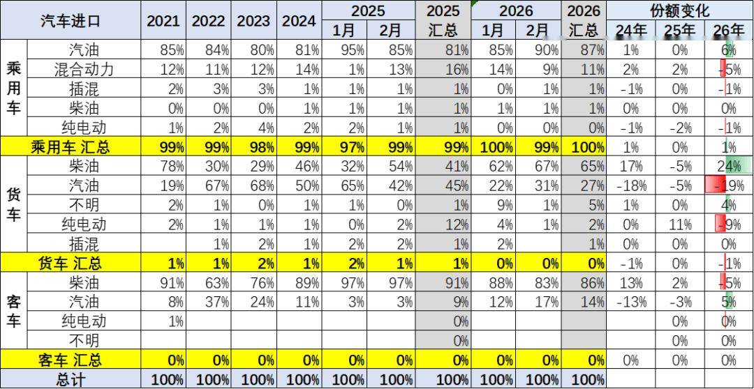 2024年进口乘用车新能源进口占比达到3%,2026年1-2月进口新能源车占比下降到1%,纯电动较去年有大幅下降,燃油乘用车仍是绝对主力。货车中的汽油车比例仍是较高的,纯电动货车下滑巨大。
