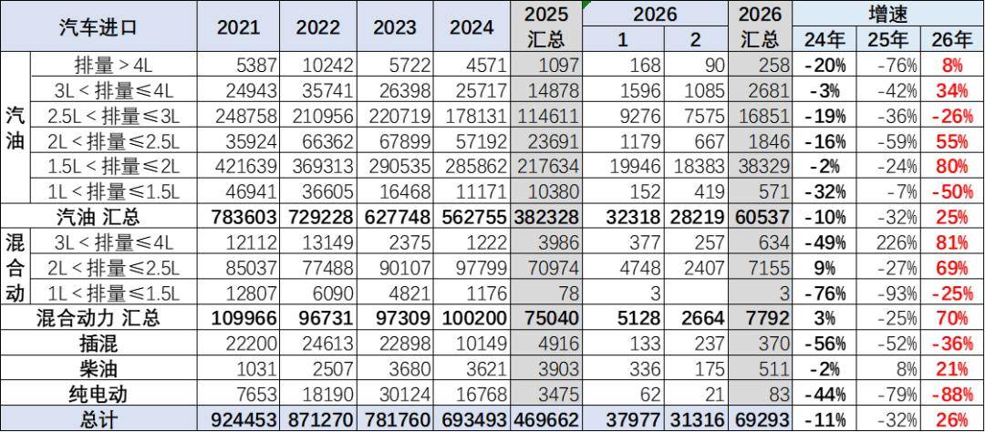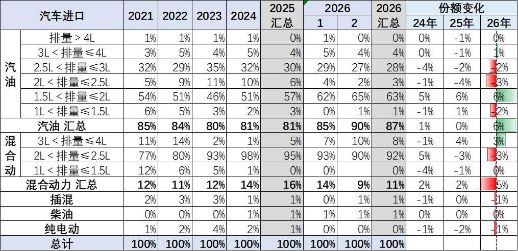 乘用车的进口车型排量原本集中于2升以下汽油车型,2026年1-2月占比整个进口车的进口量64%的比例,较去年增加4个点。