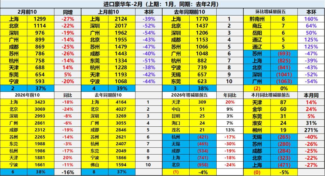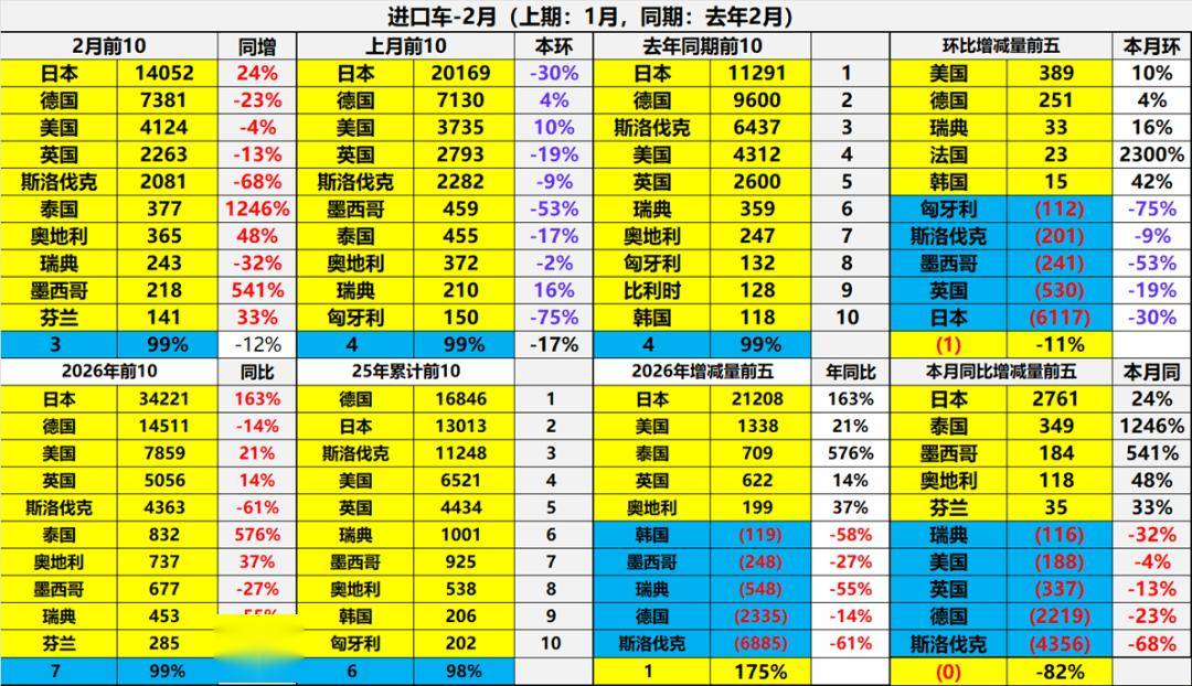 2月进口车下滑压力仍较大。2026年2月进口最高的前10国家是:日本14052辆、德国7381辆、美国4124辆、英国2263辆、斯洛伐克2081辆、泰国377辆、奥地利365辆、瑞典243辆、墨西哥218辆、芬兰141辆,其中本期较同期增量增大的前五个是:日本2761辆、泰国349辆、墨西哥184辆、奥地利118辆、芬兰35辆。