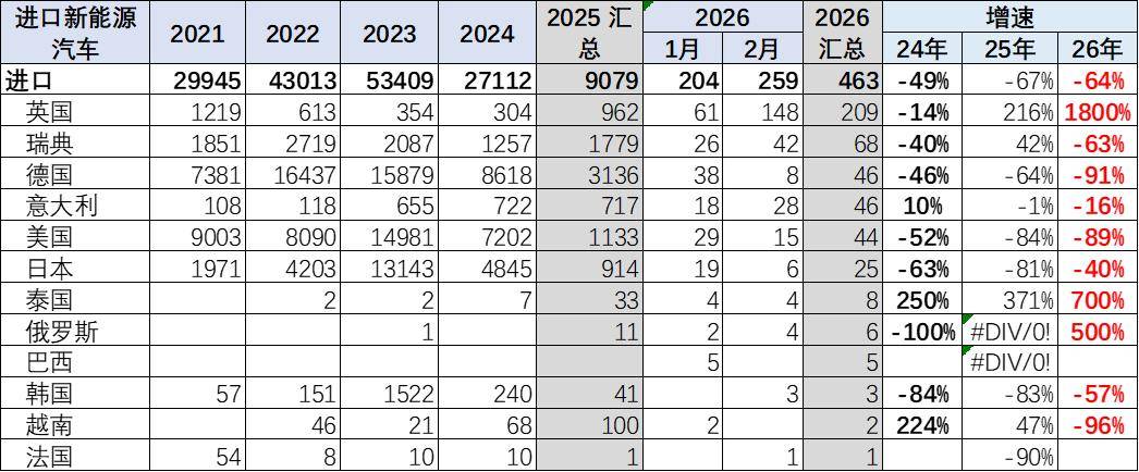 2025年国产车竞争力较强,进口主力国家的新能源车进口下滑67%。2026年进口新能源乘用车压力进一步加大,美国进口车很差,欧洲进口新能源还有一点销量。