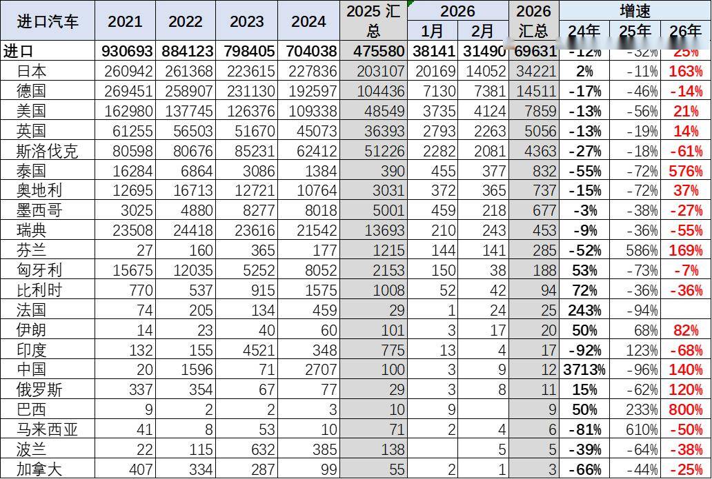 2026年1-2月进口最高的前10国家是:日本34221辆、德国14511辆、美国7859辆、英国5056辆、斯洛伐克4363辆、泰国832辆、奥地利737辆、墨西哥677辆、瑞典453辆,其中本期较同期增量增大的前五个是:日本21208辆、美国1338辆、泰国709辆、英国622辆、奥地利199辆。