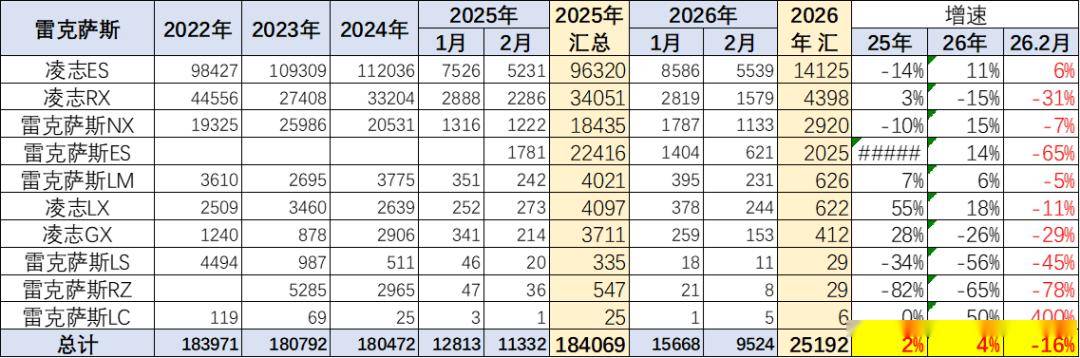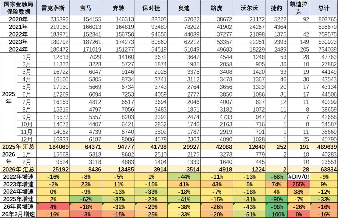 2025年的雷克萨斯的进口保险零售数据18.4万台,同比增长2%,并且雷克萨斯2025年销量高于2022年销量,在2022-2024年连续三年保持在18万水平基础上,2026年1-2月创过去四年的新高,其表现的确很强。保时捷、路虎的表现总体相对稍好。
