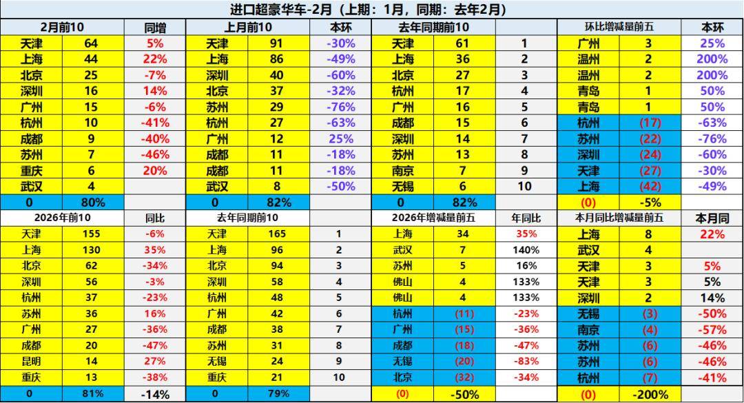进口车超豪华市场的需求总体偏弱,天津保持超豪华第一,近期上海回升较好,因股市暴增等,上海的进口超豪华车近期环比上升较大。