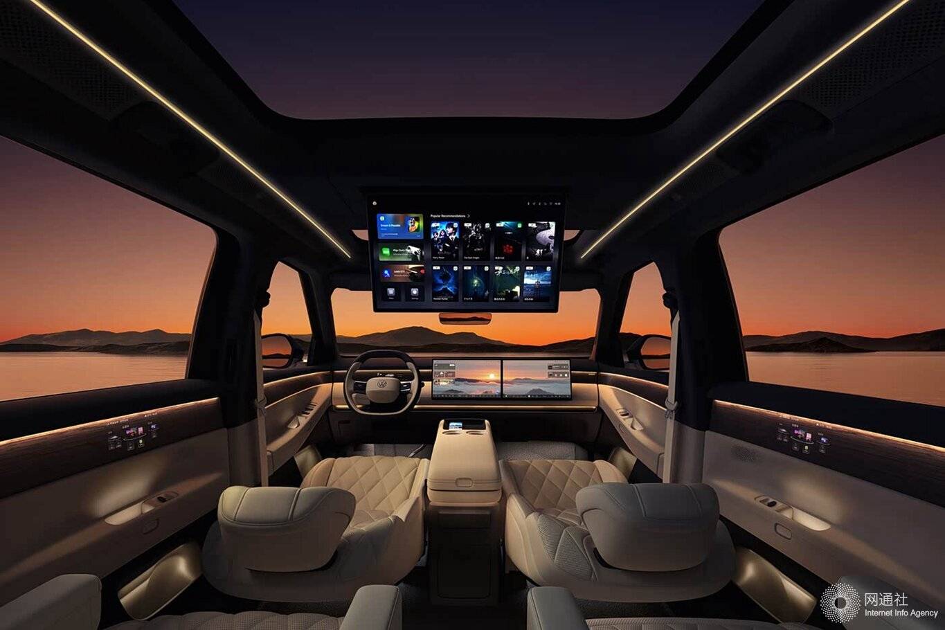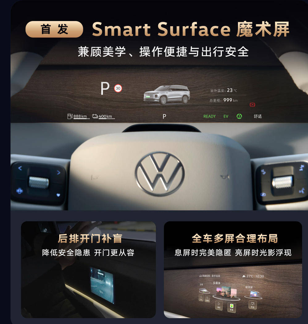 内饰方面,上汽大众ID. ERA 9X提供墨宝、本色和锦橙3种内饰色。在智能化方面,上汽大众ID. ERA 9X非常硬核,配备8.88英寸仪表魔术屏+6英寸二排门板魔术屏+15.6英寸2.5K中控双联屏+W-HUD+21.4英寸3K后排吸顶屏+流媒体后视镜+拓展手机屏,实现九屏交互。值得一提的是,上汽大众ID. ERA 9X还首发搭载了Smart Surface 魔术屏,可实现后排开门补盲。