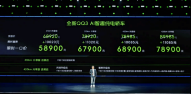 全新QQ3“入门即高配,中配即越级”。它拥有“10大同级唯一、13大同级领先”的越级品质,可谓是给出了“全球A0级精品车”的完美答案,