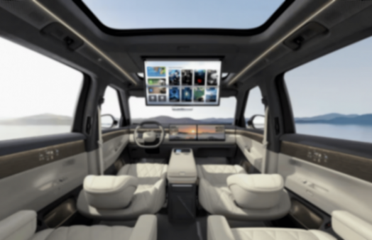 此外,新车座舱内实现九屏联动,包括15.6英寸中控双联屏、21.4英寸后排吸顶屏,以及行业首发的Smart Surface魔术屏。