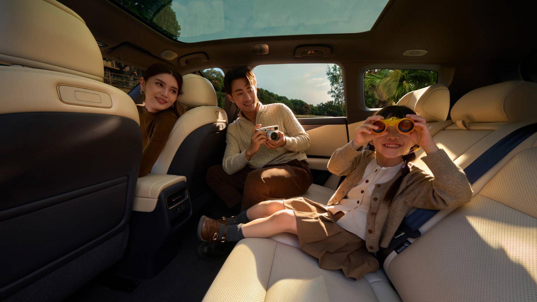 其次,由15.6英寸双联屏、63英寸AR-HUD、10.25英寸仪表屏以及后排拓展屏,组成五屏联动AI彩电,全家人的娱乐需求都能满足,导航、追剧、K歌,各取所需。而且高通8295P芯片加持AI座舱,拥有全新AI助手“小尼”,不仅能听懂粤语、四川话,还能识别场景,比如识别到小朋友上车,能自动进入亲子空间;当家人睡着了,它会自动降低音量、调小空调等,妥妥的贴心“家庭管家”。