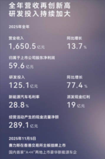 昨晚,赛力斯集团发布2025年度业绩报告,全年实现营业收入1650.5亿元,同比增长13.7%,创历史新高;归母净利润59.6亿元,连续两年实现盈利。