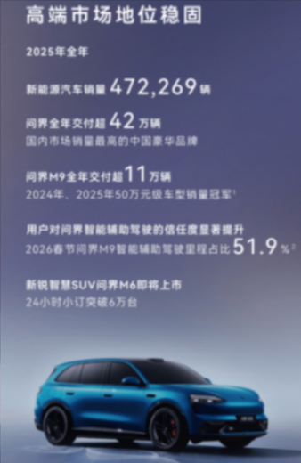 全年问界系列交付超42.6万辆,是国内市场销量最高的中国豪华品牌,旗舰车型问界M9全年交付超11万辆,连续两年坐稳50万元级车型销量冠军。