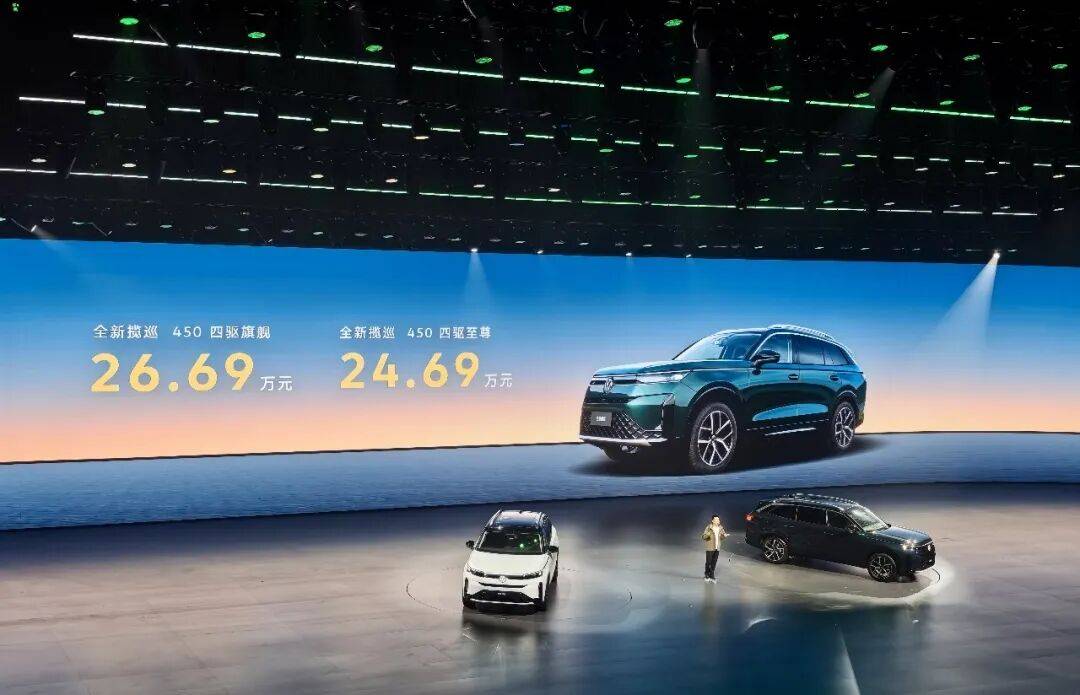 作为当天发布会的另一款重磅车型,全新揽巡亦迎来上市,两个版本,售价分别为24.69万元和26.69万元。大尺寸格栅加持的硬朗前脸造型,仍然让人耳目一新,车侧的平直腰线则凸显着中大型SUV之体量,后部的立体式尾灯与运动化排气既稳重、亦有力。