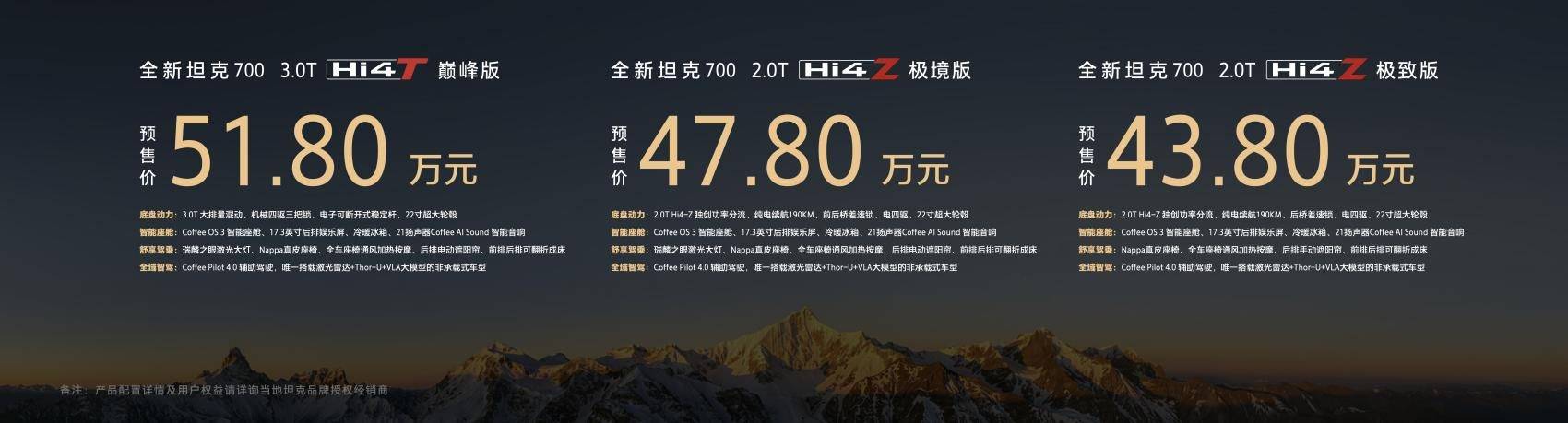 3月30日,全新坦克700正式开启预售,提供3.0T Hi4-T与2.0T Hi4-Z两大动力版本、共3款车型,官方预售价区间为43.80万元至51.80万元。