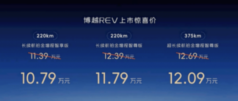 3月31日,吉利博越REV正式上市,定位A+级增程SUV,共3款车型,官方指导价11.39-12.69万元,4月30日前限时惊喜价10.79-12.09万元。新车主打“长续航+亲民价”,直接切入10-13万家用增程市场。