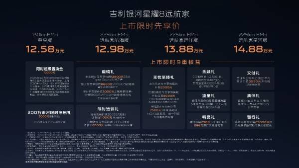 3月30日,吉利银河星耀8远航家系列加新上市。在原有130km EM-i尊享版基础上,新增三个225km纯电续航版本,上市限时先享价12.98万元至14.88万元。新车携手演员黄宗泽,以“阿sir的新车”为场景化主题,突出产品在颜值、科技与续航等方面的综合表现。
