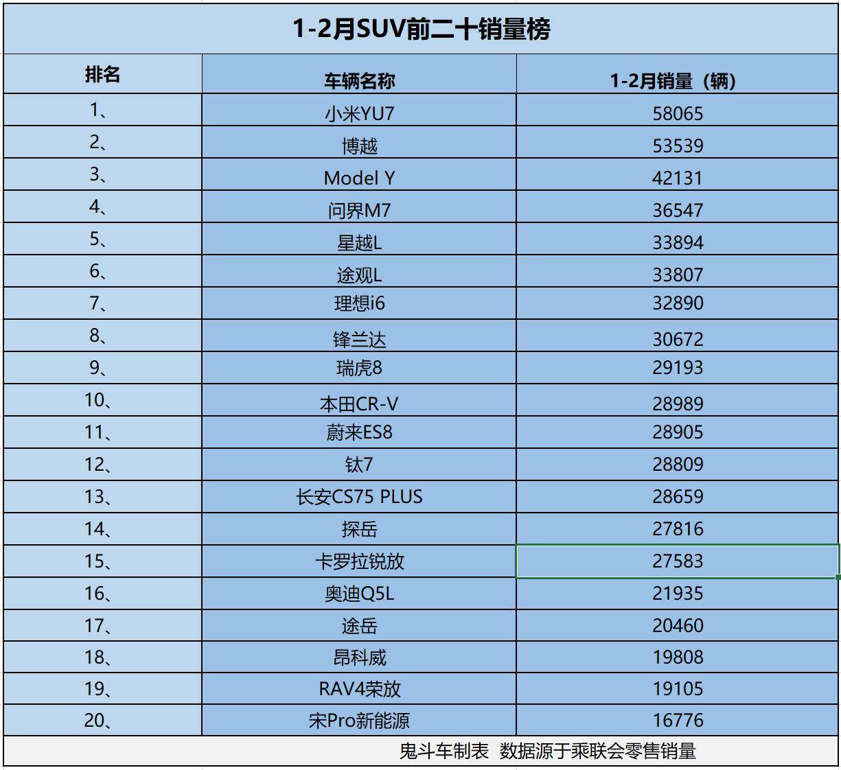 日前,小编从1-2月乘联会零售销量数据中看到,1-2月的SUV市场,销量表现火爆的车型不在少数。为了让网友们看得更清楚,鬼哥整理出1-2月SUV销量排名前二十榜单。榜单上,共有17款SUV车型1-2月累计零售销量超过2万辆,接下来,看看具体车型排名与销量表现。
