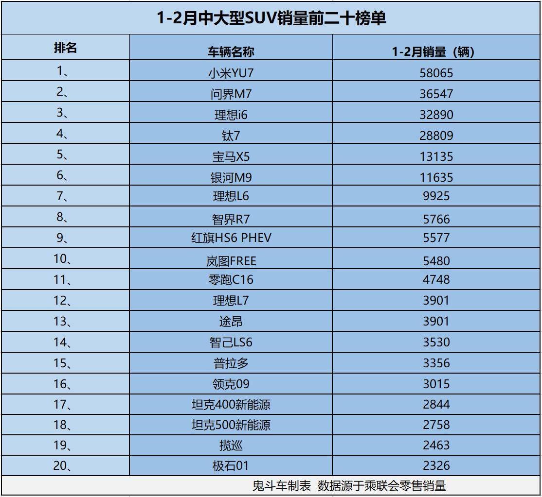 越来越多新“成员”的加入,打破原有市场格局。销量排名上变化尺度很大,日前,乘联会发布1-2月零售销量数据,小编整理出中大型SUV市场销量排名前二十榜单。榜单上,共有6款车型累计零售销量超过万辆,接下来,看看具体排名与销量表现。