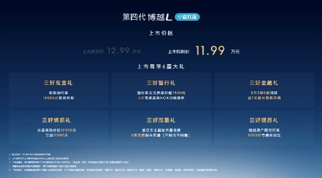 4月3日,吉利博越L小蓝灯版正式上市,新车共计推出1款车型,上市指导价12.99万元,上市限时价11.99万元,新车搭载千里浩瀚辅助驾驶H3方案。即日起至4月30日,用户购买第四代博越L小蓝灯版可限时享换购补贴12000元,博越用户换购还可叠加3000元专属换购金,此外还有7年超长贷等金融礼、流量礼、智行礼共计6重上市大礼。