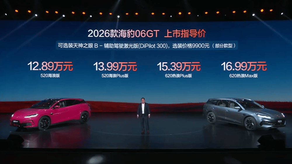 其中,2026款海豹06GT共有两种续航四款版型,上市指导价为12.89-16.99万元;