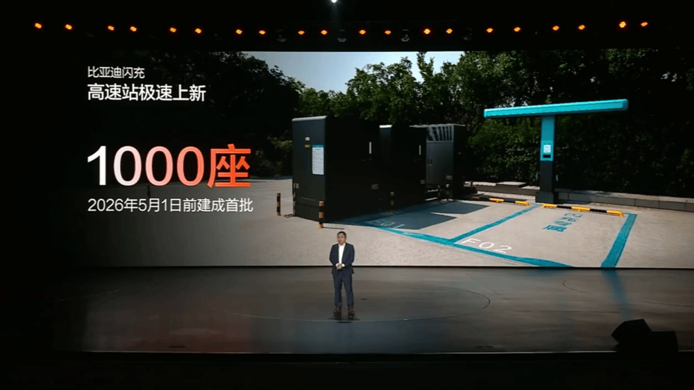 在接下来即将到来的劳动节前,比亚迪将建成首批1000座高速闪充站,到2026年年底前建成闪充站20000座。