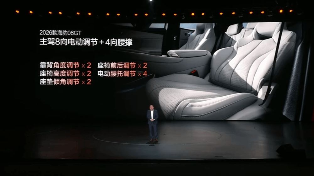 舒适性配置方面,2026款海豹06GT增加主驾8向电动调节和4向腰撑,可有效缓解疲劳,同时还拥有前排座椅通风与加热功能。