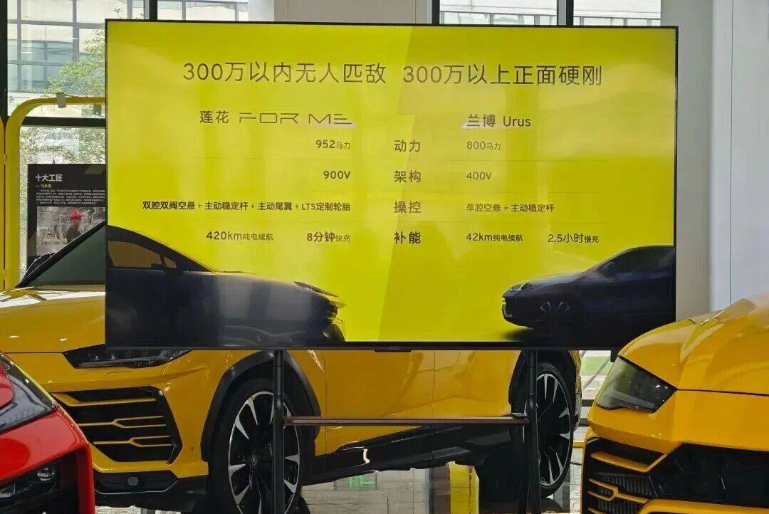为什么会有这样的反应?先看看For Me对标的是谁。去年12月的预售发布会上,莲花For Me曾和法拉利Purosangue、兰博基尼Urus一较高下,并在核心配置上全面胜出。