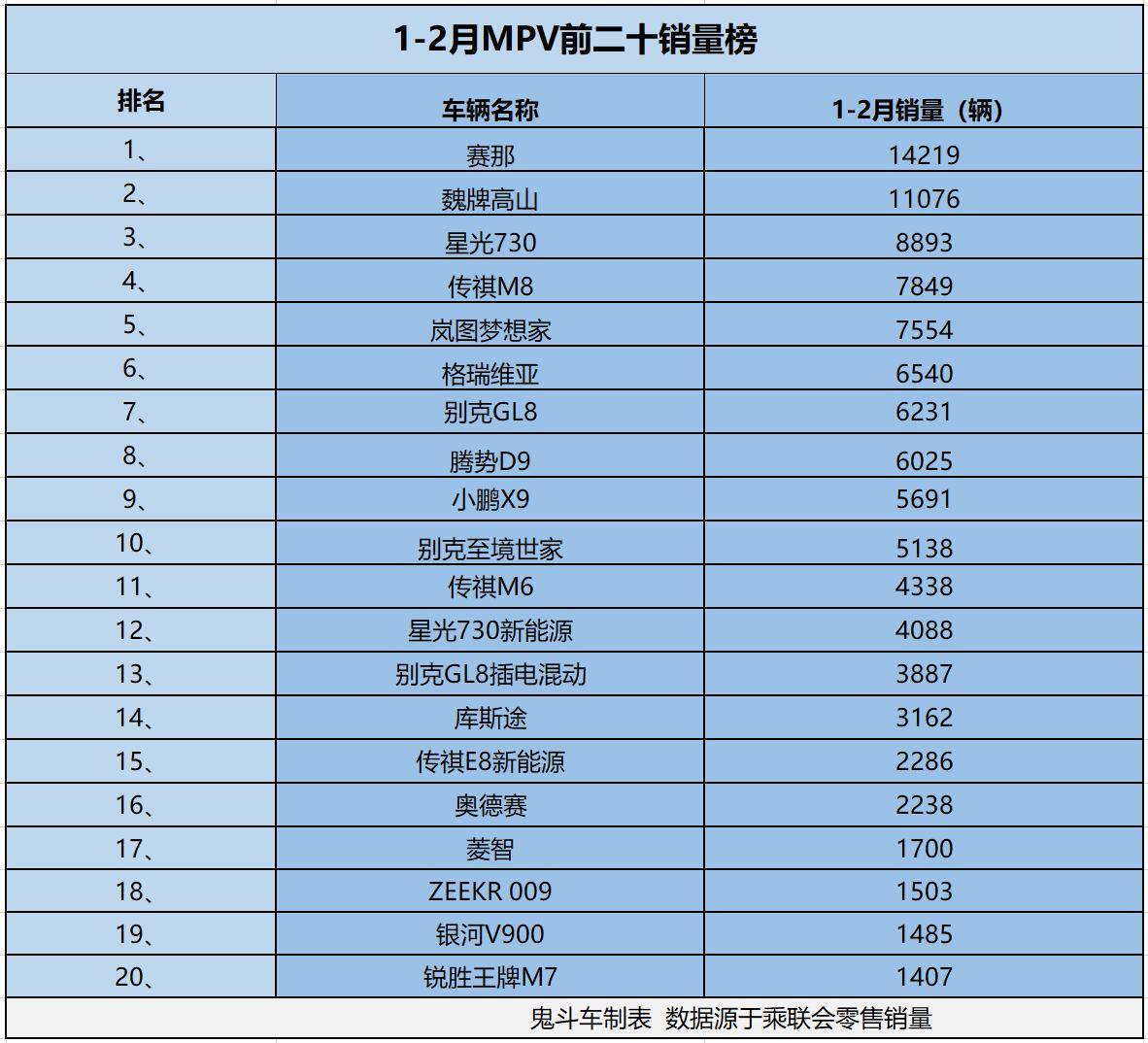 此外,进入前二十销量榜单的车型还有奥德赛、菱智、极氪009、银河V900、锐胜王牌M7,这些MPV车型1-2月累计零售销量都超过1400辆。
