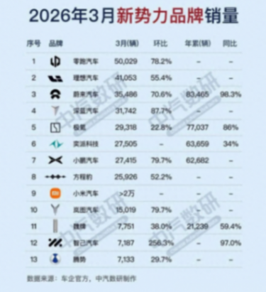 4月1日,国内造车新势力如期交出2026年3月及一季度销量答卷。作为春节后首个完整生产月份,3月数据不仅验证了各品牌产能爬坡的真实水平,更彻底撕开了新能源赛道新一轮洗牌的序幕。